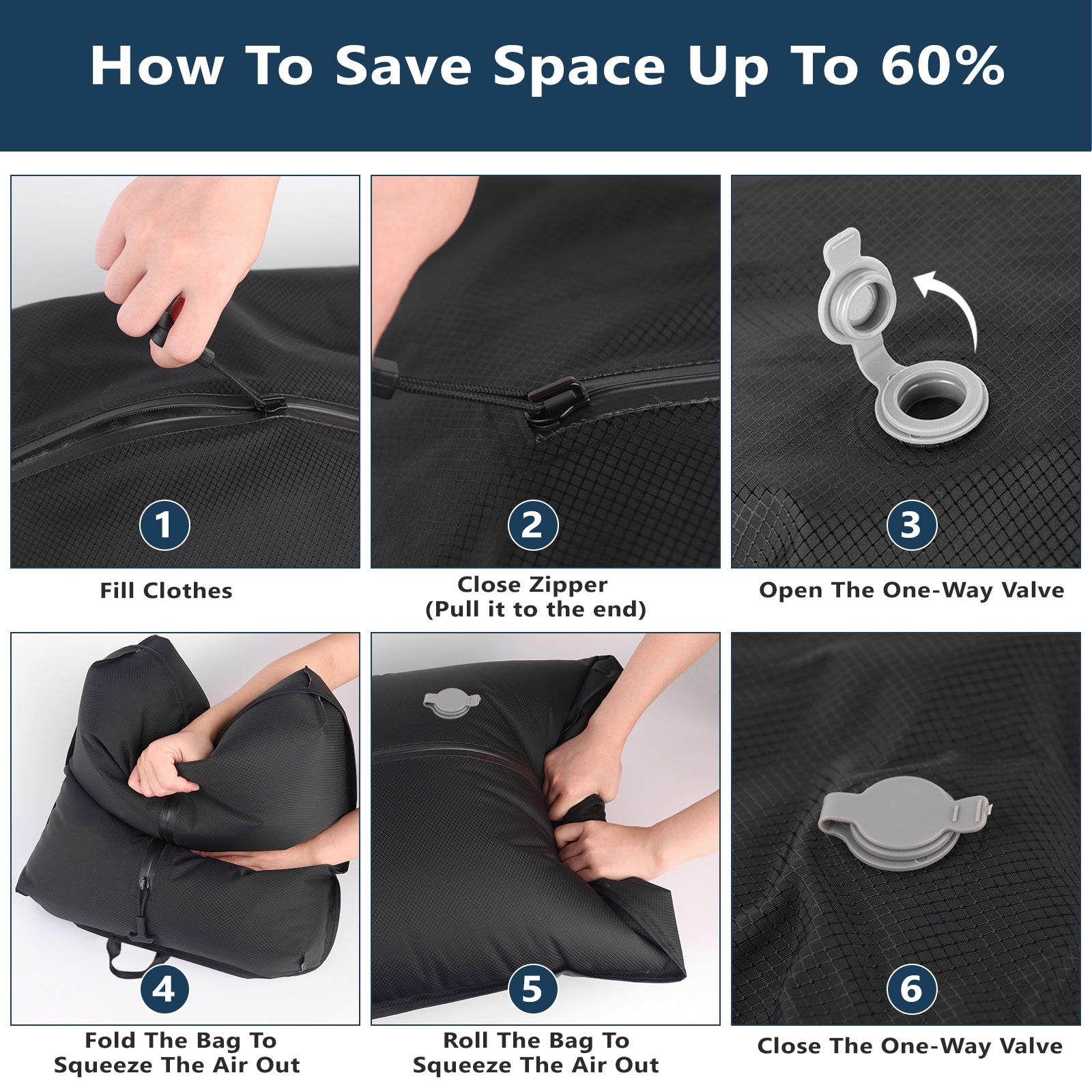 - 【Professional Travel Vacuum Bags】Crafted with 210D thickened polyester TPU composite, our vacuum bags are ultra-lightweight, tear-resistant, and soft to the touch. Achieve 3x compression for up to 60% space-saving. Say goodbye to messy suitcases and backpacks, so you can become a master packer.