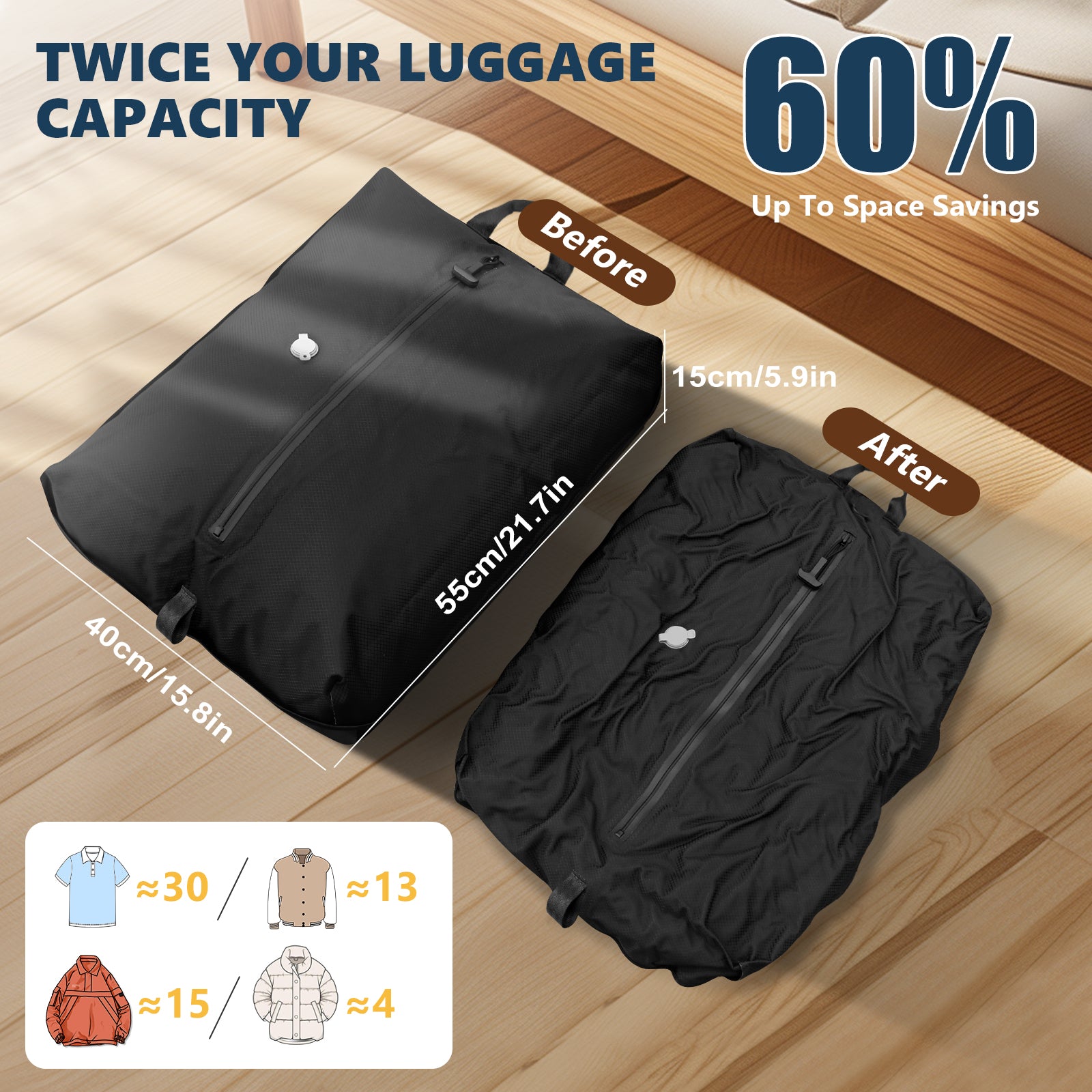 - 【Large Capacity】The size of our vacuum travel compression bag is 55*40*15cm (21.7*15.8*5.9in), our bags are larger in size and have more capacity than the same type of bags on the market, and can hold up to 33L of laundry, fit into a suitcase or as a compression bag for backpacks over 35L. Perfect for 7-10 days of worry-free travel or business trips.
